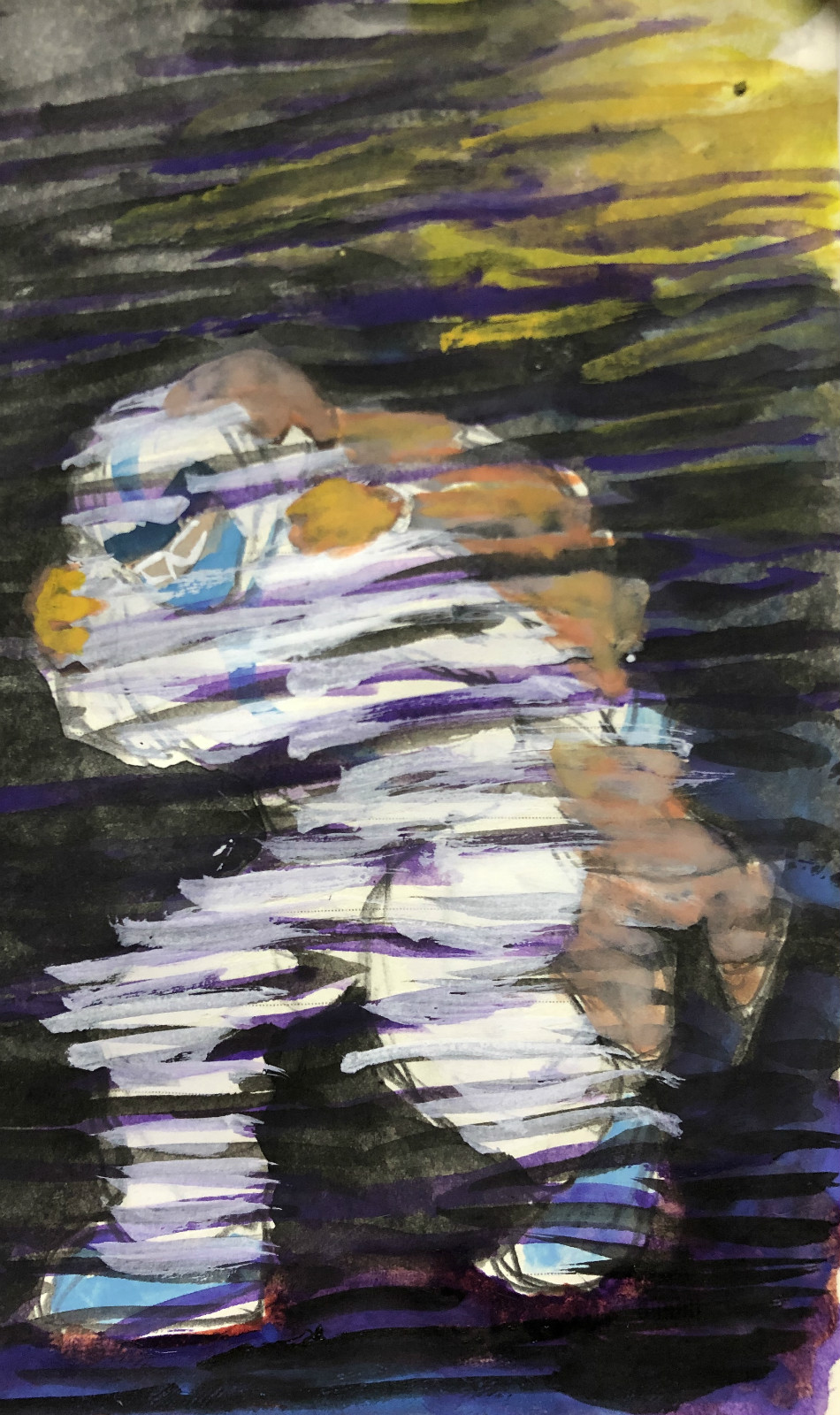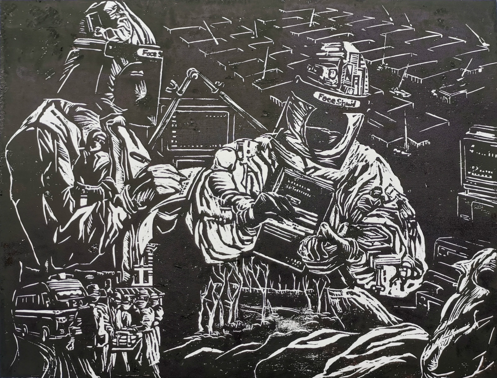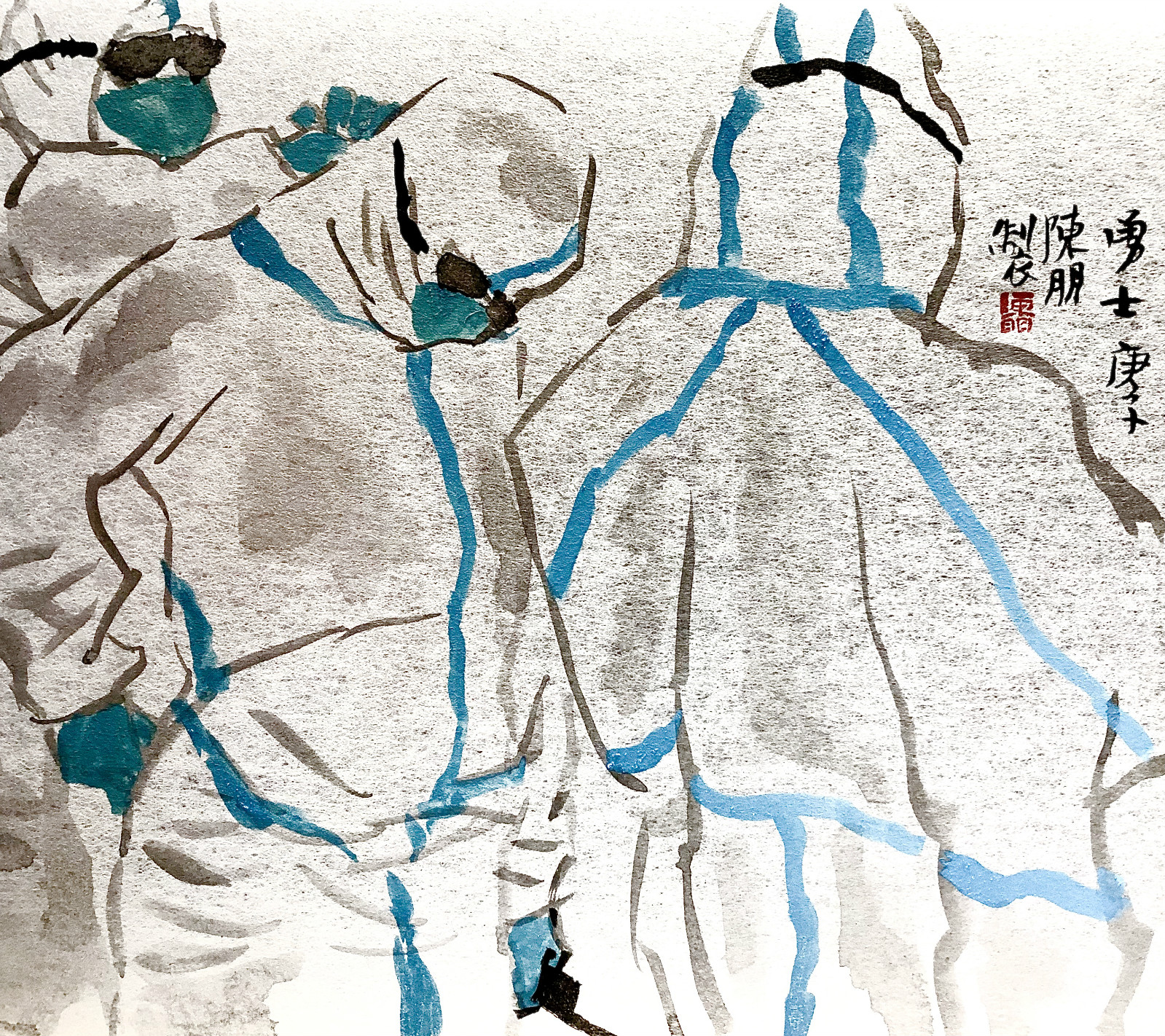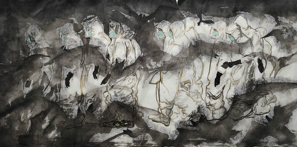 创作感言:医生不顾个人安危,冲在战“疫”的最前方,我深深为他们的壮举所感动。这幅作品描绘了身穿安全装备的医生们,集结奔赴前线的场景,画中的背景运用墨色进行渲染,并把蝙蝠的形象融入到里面去,烘托出当前的疫情。我把作品命名为:真正的猛士,向白衣战士们致以崇高的敬意!