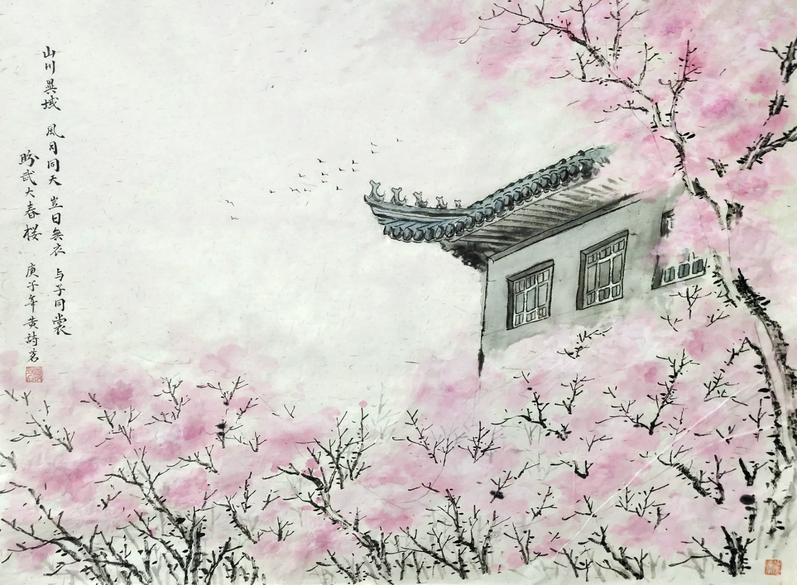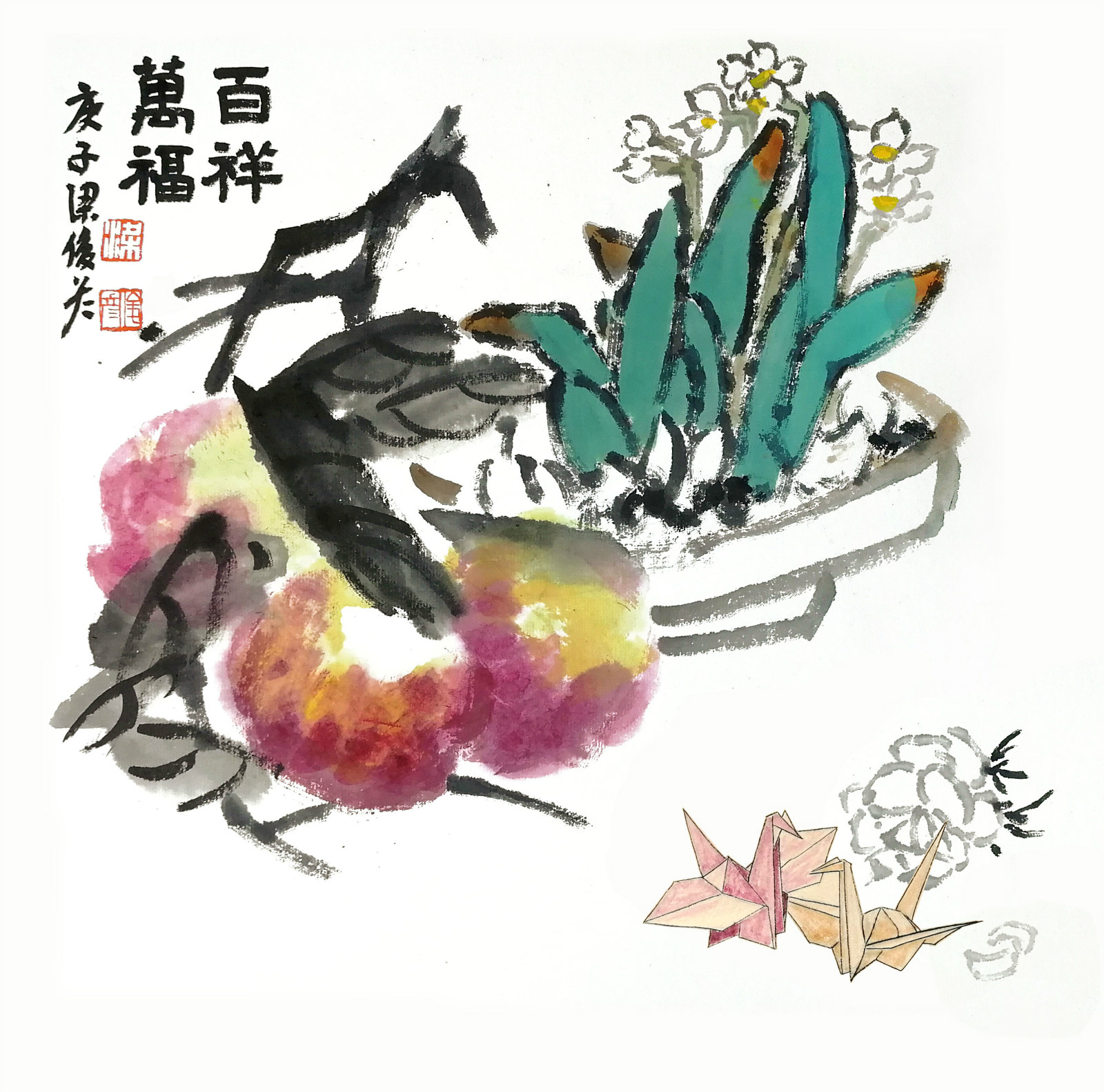 创作感言:康子初春,一个不速之客——新冠病毒的来袭,打乱了整座城市的节奏。尽管如此,从战“疫”开始至今,可以看到全国上下团结一致,众志成城抵抗疫情。我用吉祥的仙桃、水仙、百合、千纸鹤组合成画,寓意受病毒感染的患者能早日康复,祝愿祖国繁荣富强,百祥万福!