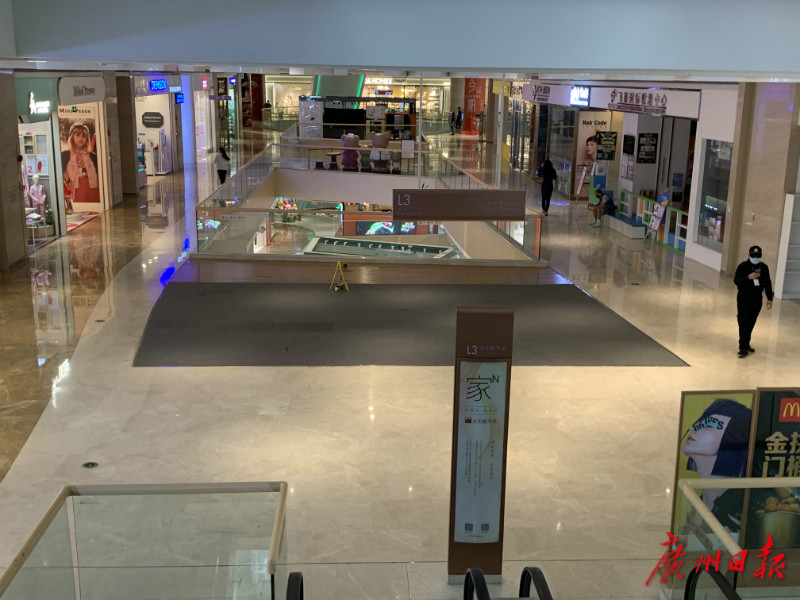 今日,广州日报全媒体记者现场所见,受到新旧物业公司交接问题的影响,商场的冷气都被关停,场内显得闷热。停车场更是处于封闭状态,市民顾客不能开车进入。场内也只有一半的租户开业,大部分租户乌灯黑火。太阳新天地当今的境况,与几年前全盛时期相比,已经不可同日而语,令人唏嘘。
