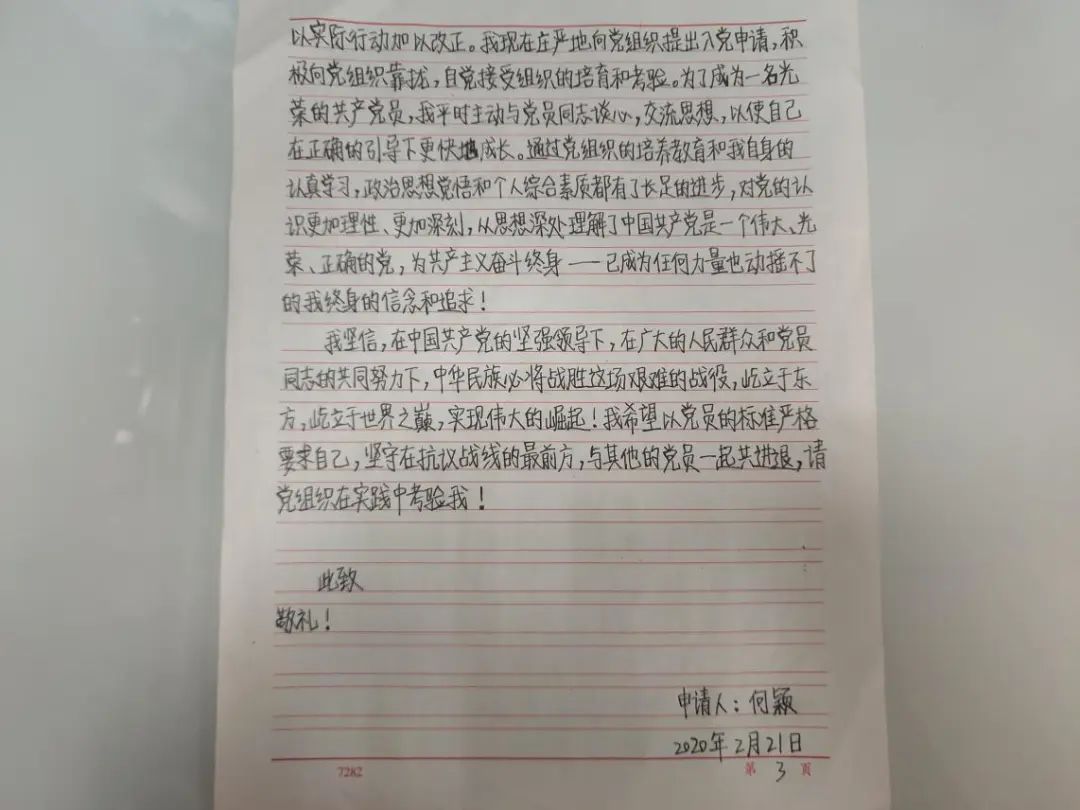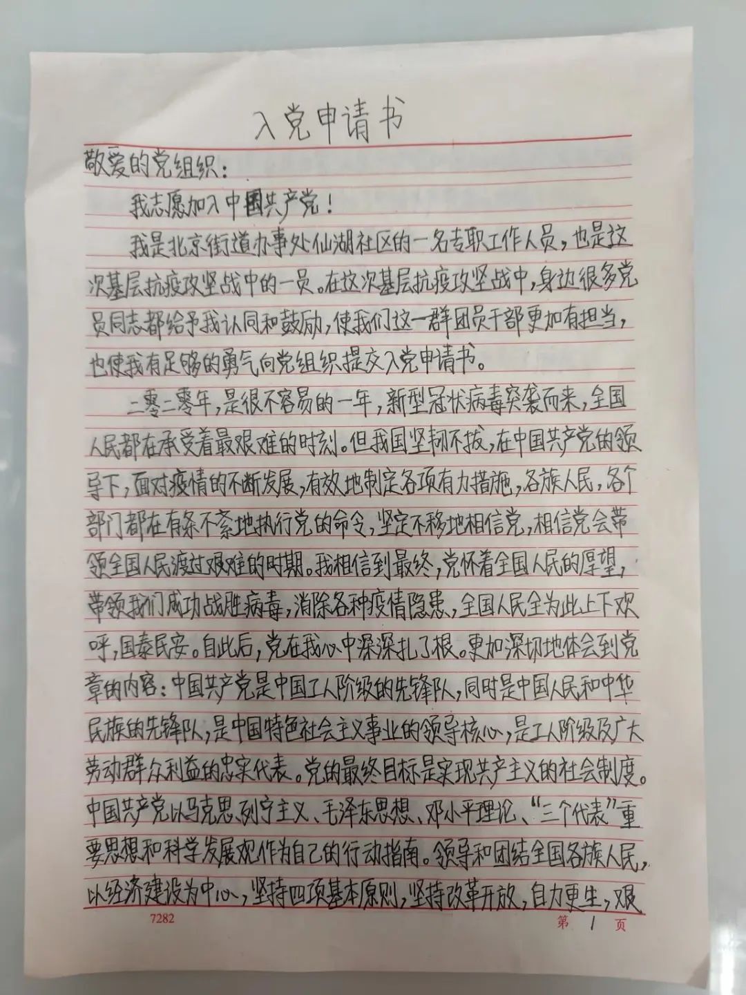 在疫情防控期间,冲在一线的党员们成为最好的榜样,在他们的感染与鼓舞下,仙湖社区年轻的社区民政专干何颖把入党申请书作为抗击疫情请战书,为打赢这场没有硝烟的疫情防御攻坚战,竭尽所能贡献自己的力量。