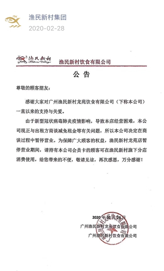 今天下午3点29分,渔民新村集团在其官方微信公众号上发布一则消息,称将对旗下自有商用物业租户(除住宅外)的租金进行减免支持,对2020年2月、3月、4月每月减免50%的租金。而在昨夜深夜11点11分,其官方微信公众号还发布称渔民新村龙苑店暂停营业。