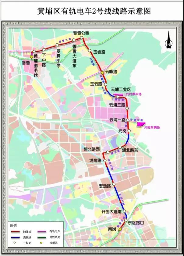 有轨电车2号线是黄埔区南部的南北向骨干线,集商务、居住、通勤及旅游观光于一体。预计2022年全线建成通车,方便黄埔中心与东部组团联系。该线路建成后,日行高峰每小时客流量4000人。