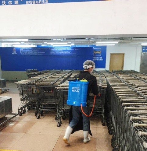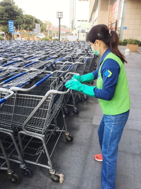 在广州沃尔玛商场,入口购物篮和购物车在经使用后,便有工作人员前往消毒清洁。据了解,公共区域目前每天至少消毒3次。沃尔玛方面告诉记者,严格按照相关的操作规范,已启动全店消毒措施,涵盖顾客能接触的区域,如出入门把手、购物车、自动扶梯、收银台、冷柜把手、卖场地面、服务台等,以及空调通风系统、加工区域、收货及办公区域等。加强商场和办公场所的消毒、清洁卫生与防疫工作,力保商场的环境健康和安全。