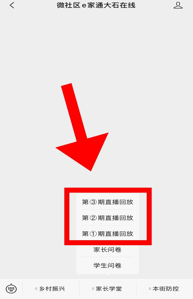 可点击“微社区e家通大石在线”栏目“家长学堂”,观看所有直播的回放视频。