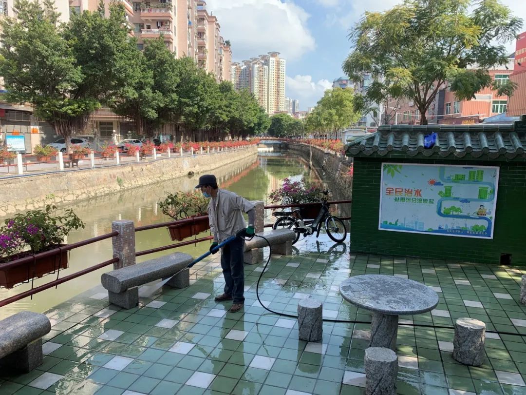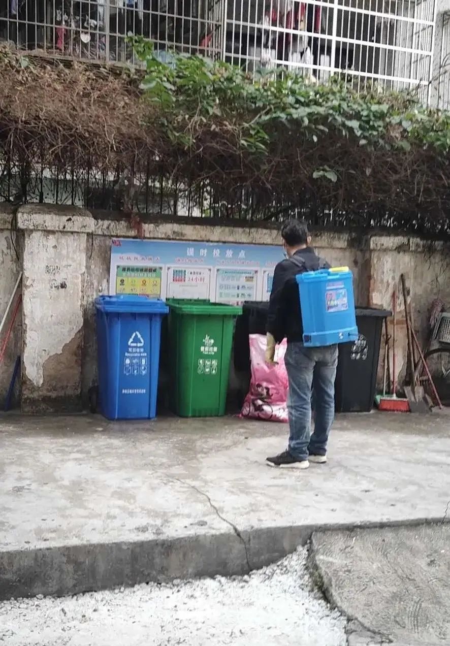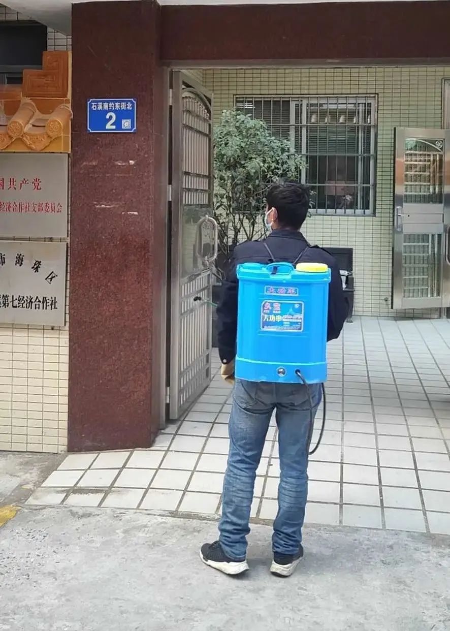 在洒水车通行不了的巷道,石溪环卫队的保洁员就背着几十斤重的消毒桶进行喷洒。虽然不断重复着同样的工作,但保洁员们都没有丝毫懈怠,默默坚守在岗位上。一趟下来,满身大汗、衣服湿透是他们的常态。