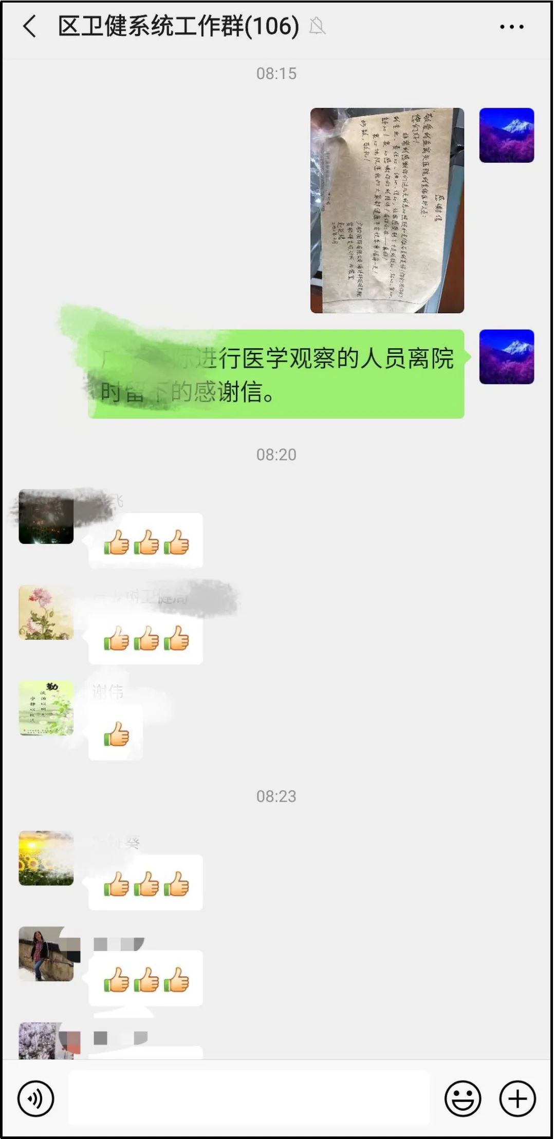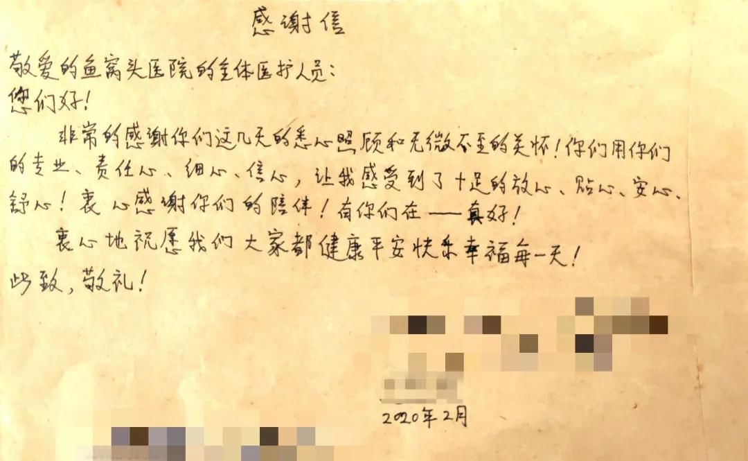 信中写道,敬爱的鱼窝头医院的全体医护人员:你们好!非常感谢你们这几天的悉心照顾和无微不至的关怀!你们用你们的专业、责任心、细心、信心,让我们感受到了十足的放心、贴心、安心、舒心!衷心感谢你们的陪伴!有你们在——真好!衷心地祝愿我们大家都健康平安快乐幸福每一天!