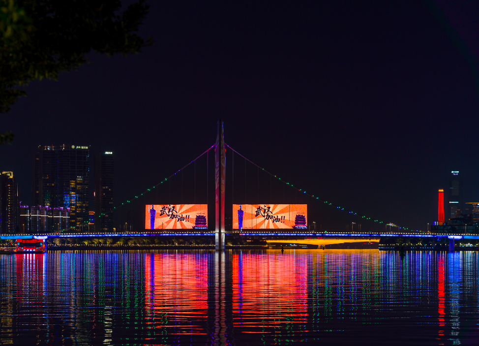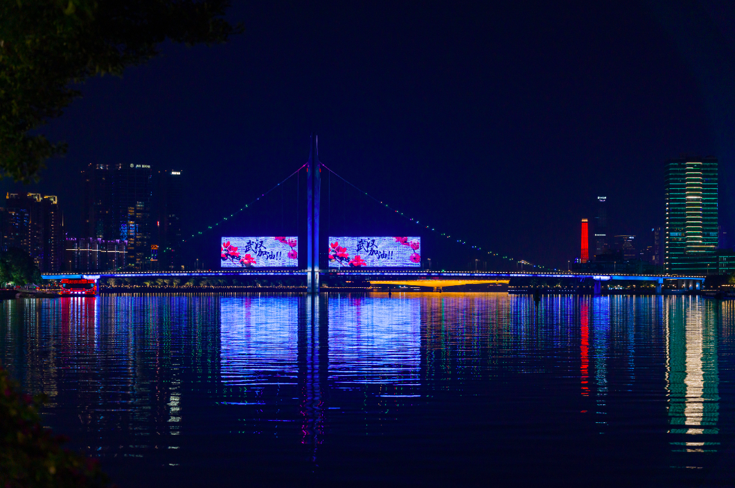 该组为组图,摄于猎德大桥,通过led屏幕的灯光变化展现不同的主题:第一幅为木棉与樱花之约,第二幅为广州塔与黄鹤楼之约。