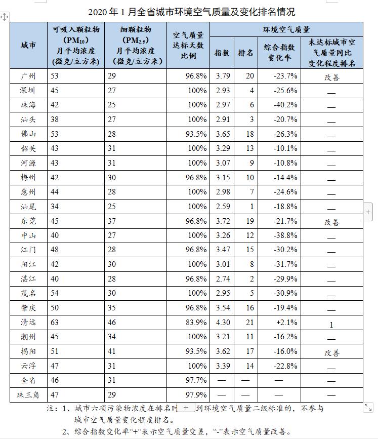 省生态环境厅4日公布了2020年1月广东省城市空气和水环境质量及排名情况,1月全省的空气质量达标率为97.7%,21个地级市中有12个城市的达标率为100%。