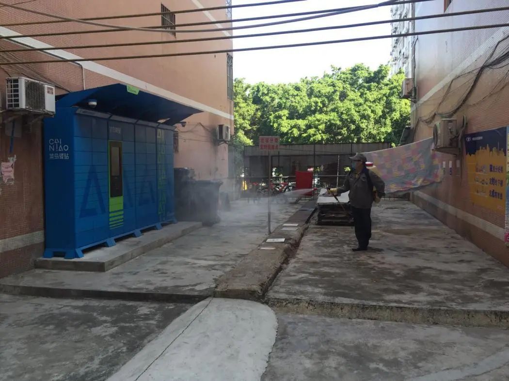 在平台上,消杀队员严格按照操作规范进行喷洒,对出入口、下水道、垃圾桶、快递柜等区域进行喷洒消毒杀菌,确保没有卫生死角,阻断病毒传播途径。