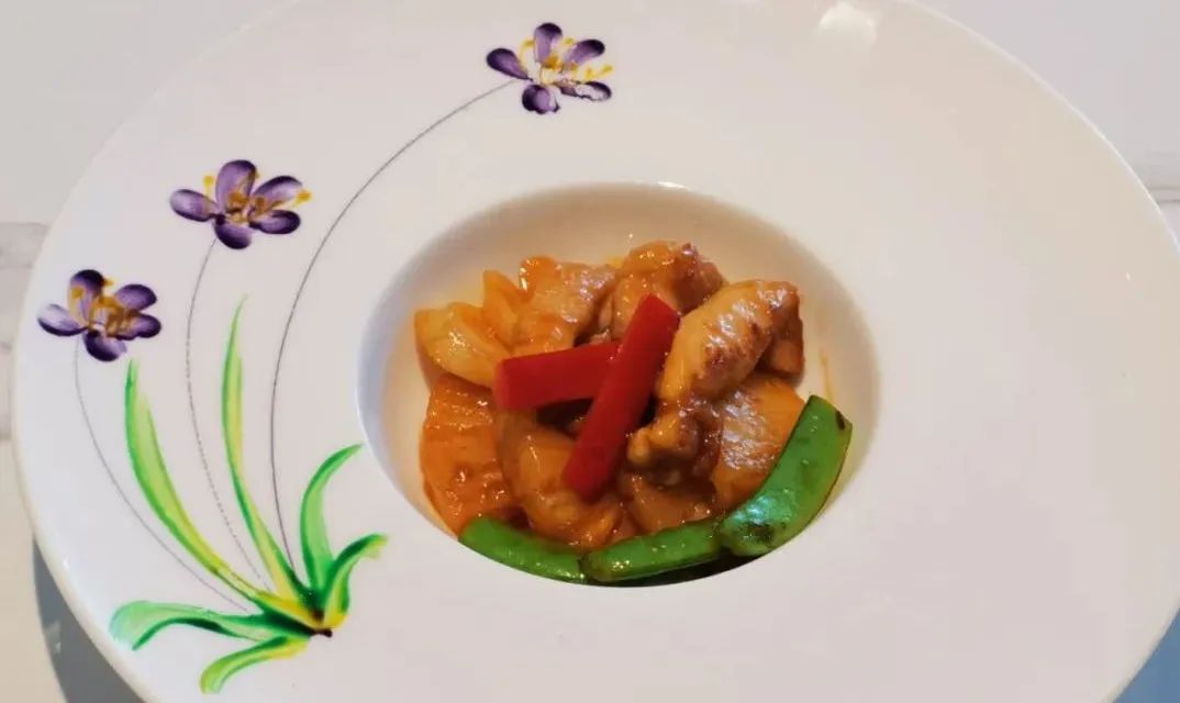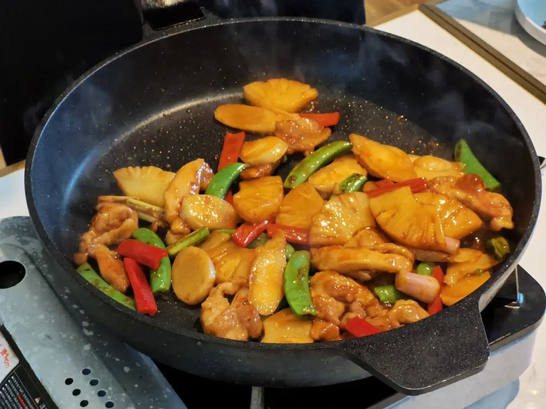 5、继续使用镬内余油,加入酸子姜片和菠萝件、甜豆炒一炒,加盖继续中火烹一分钟,加入之前煎好的鸡柳和五杯汁,猛火翻炒后起镬。