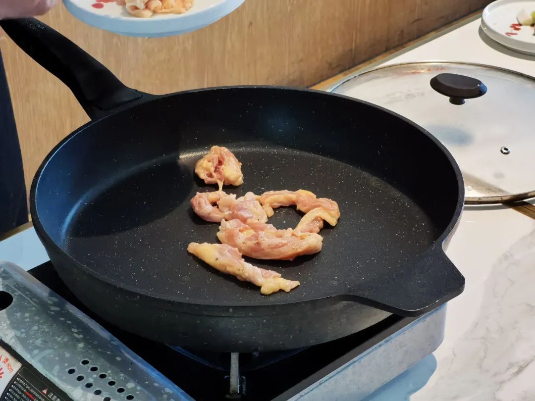 4、烧热煎锅,不用放油,平铺鸡柳在锅面上,后加盖,中火煎三分钟,倒起备用;