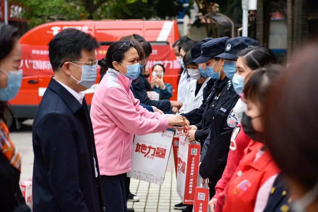 3月6日下午,荔湾区妇联工作人员和京东物流快递小哥,以彩虹街园中园社区为起点,开始了慰问活动。在园中园社区广场,公安民警、出管队员、环卫工人、热心志愿者等荔湾巾帼收到了慰问礼包。
