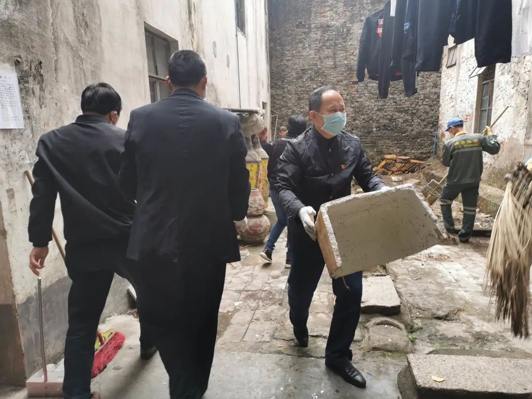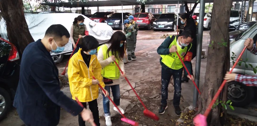 街道办事处副主任肖苏与驻点干部在惠城社区进行清洁行动。