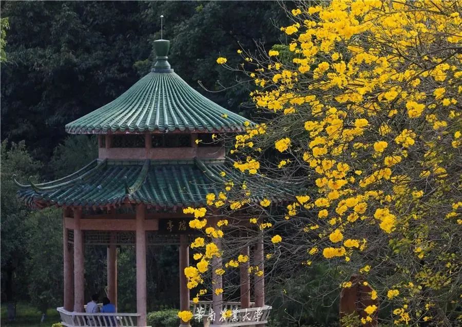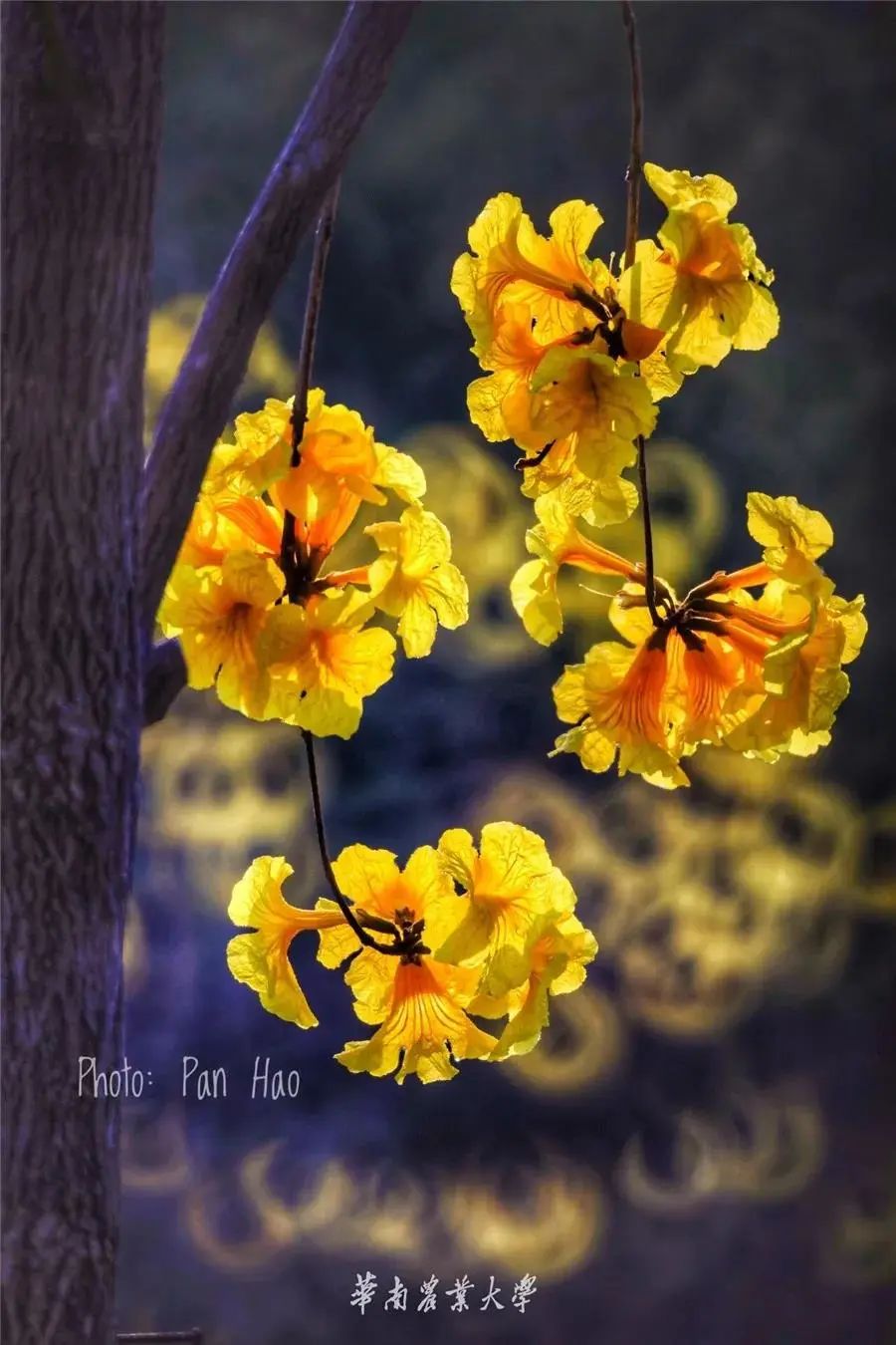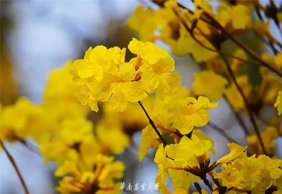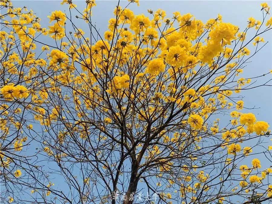 黄花风铃木,有“黄金风铃木、伊蓓树”之称,主要分布在华农行政楼前和图书馆后。