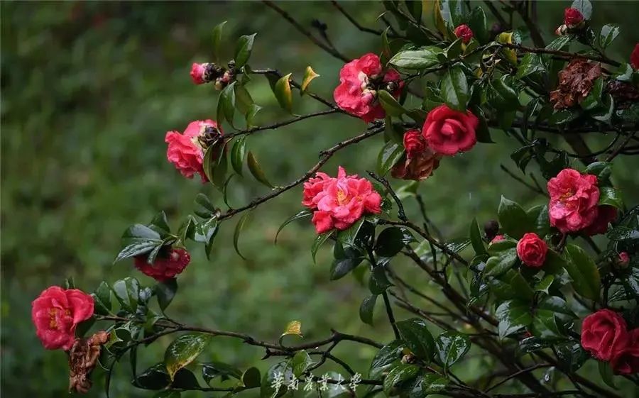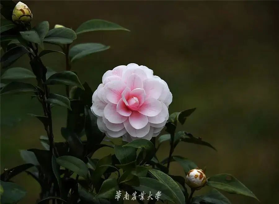 茶花又名山茶花,是山茶科、山茶属多种植物和园艺品种的通称。花瓣为碗形,分单瓣或重瓣,茶花各色,花枝最高可以达到4米。茶花既有“唯有山茶殊耐久,独能深月占春风”的傲梅风骨,又有“花繁艳红,深夺晓霞”媲美牡丹的艳丽,令人心驰神往。华农校内的茶花主要集中种植在5号楼(校史馆)东、南、西侧草坪,被命名为山茶园。