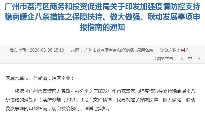 根据《广州市荔湾区人民政府办公室关于印发广州市荔湾区加强疫情防控支持稳商暖企八条措施的通知》(荔府办规〔2020〕1号)文件精神,广州市荔湾区商务和投资促进局筹备组制定了保障扶持、做大做强、联动发展事项的申报指南,来看看都有哪些申请条件和奖励!