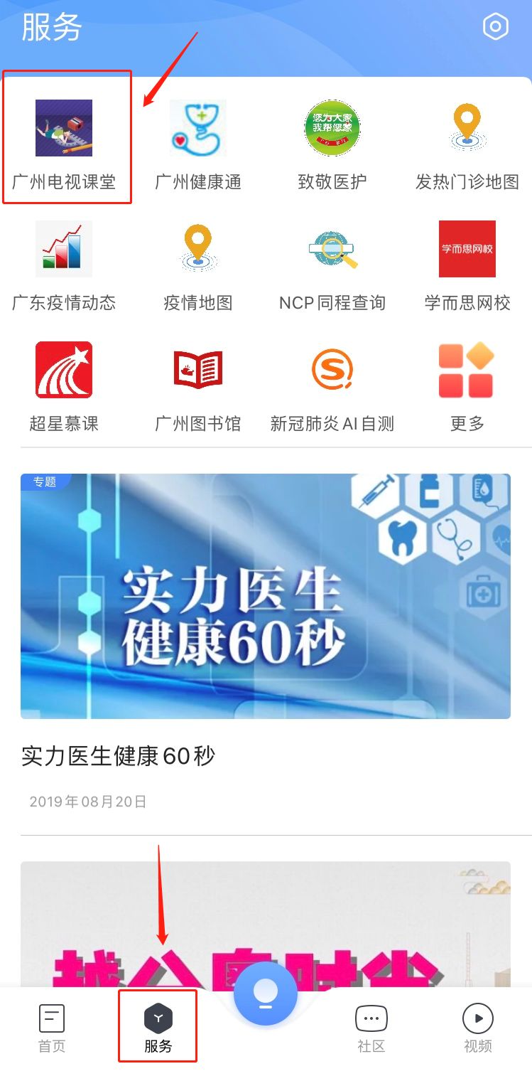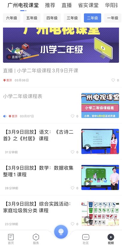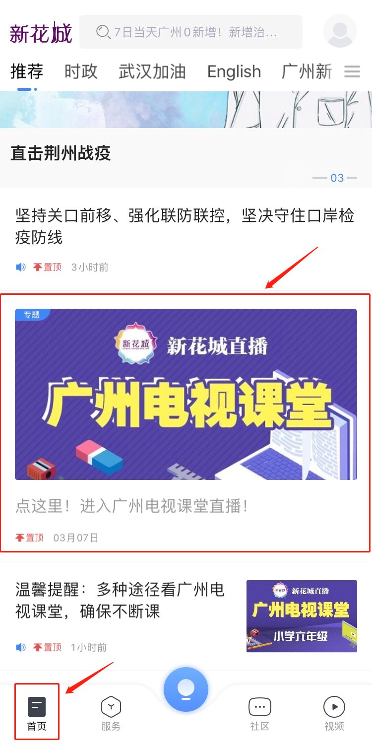 打开“新花城”点击下方“服务”板块点击“广州电视课堂”入口即可进入各年级直播页