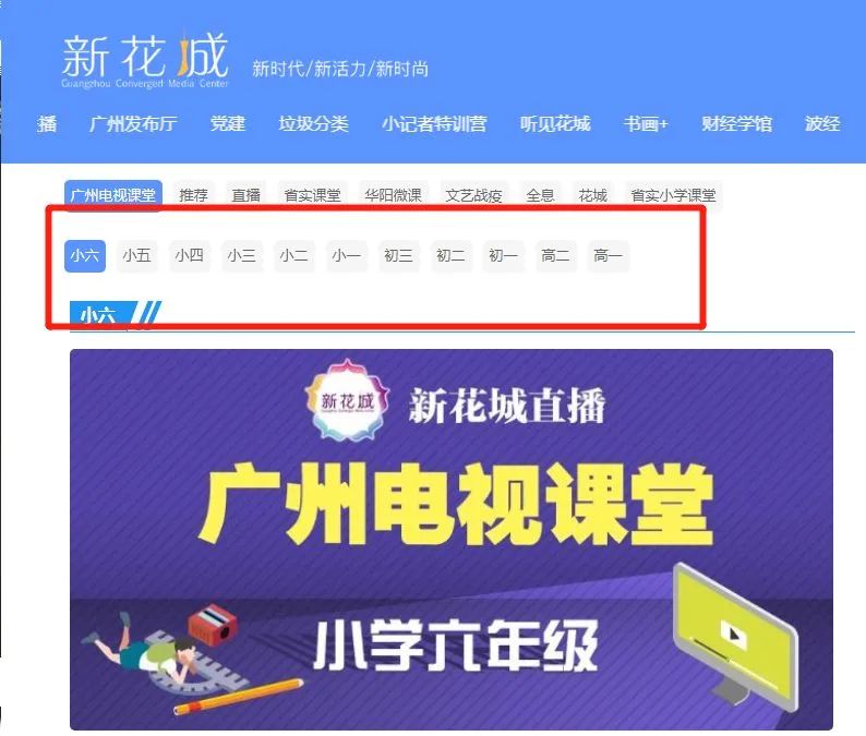点击新花城网站(PC端):https://www.gz-cmc.com/选择:视频--广州电视课堂选择需要观看的年级,就可以观看课程直播和课程回放