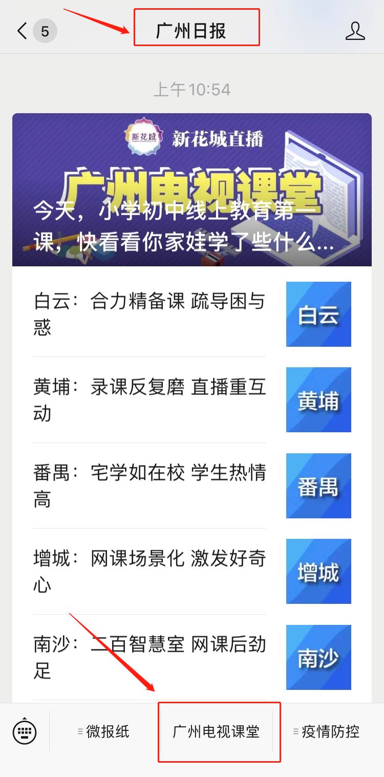 微信关注“广州日报”官方微信公众号点击页面下方“广州电视课堂”即可进入各年级课程直播页