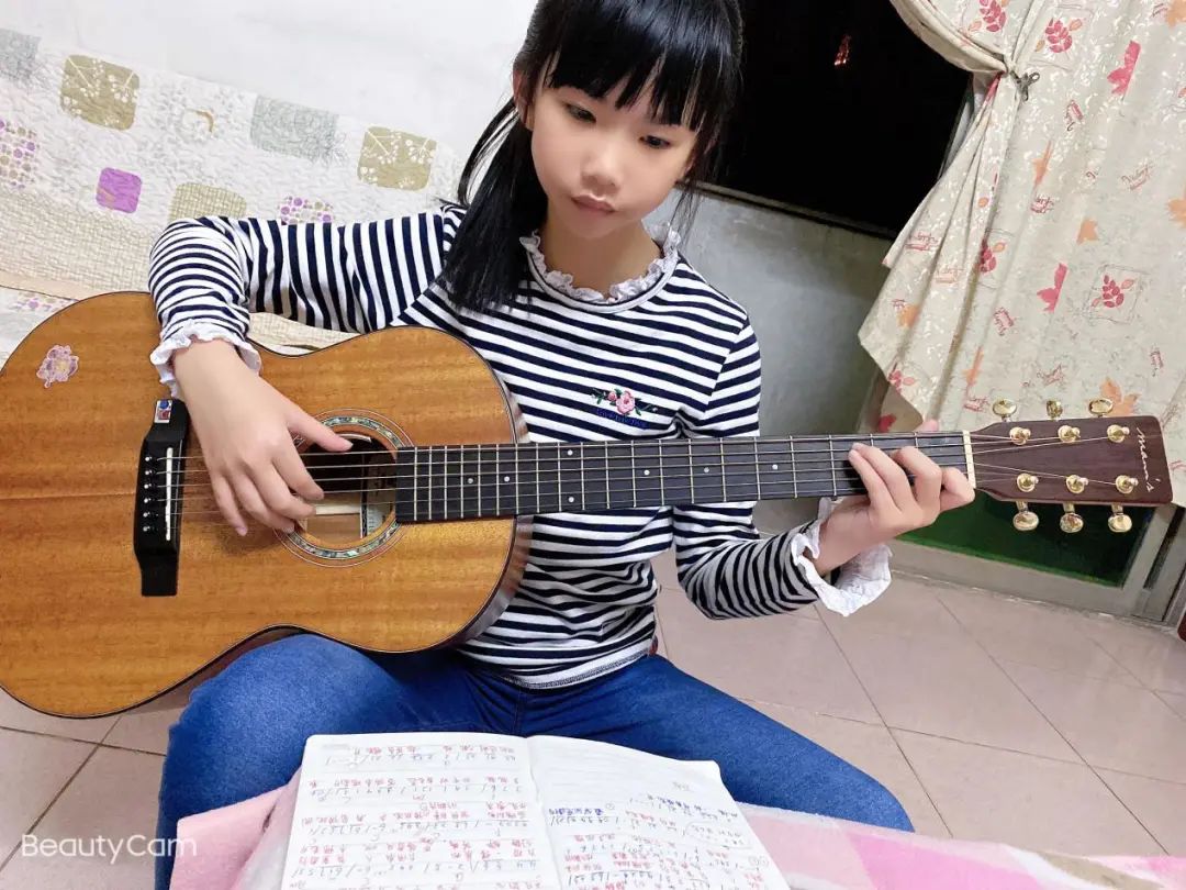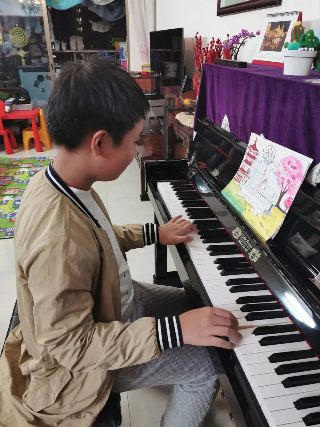 六年级陈棨淏在用钢琴演奏自己的歌配画作品