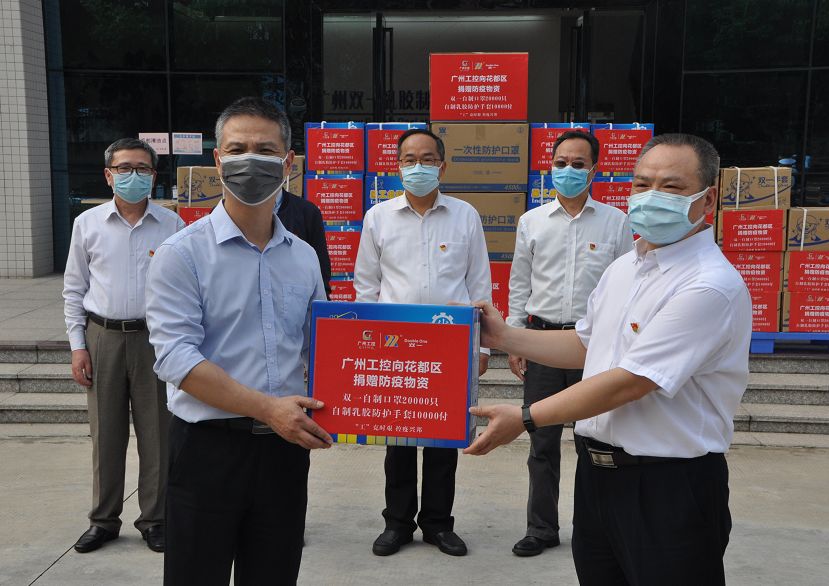 此次双一公司向花都区捐赠一次性防护口罩2万个,乳胶黑工业防护手套5400付、牛筋手套2400付、家用手套2200付,合计捐赠乳胶手套10000付(价值47535元)。定向捐赠给花都区直机关工委、区应急管理局、区城管局党员志愿者和一线防疫人员。黄伟林、李耀棠、广州工控相关负责人见证捐赠仪式。