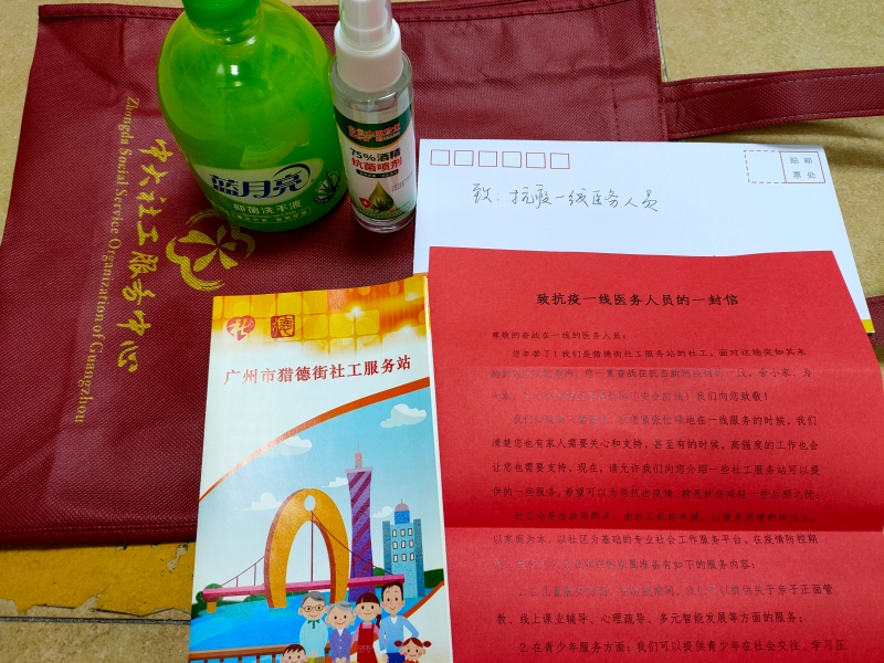 爱心礼包中放置了社工和志愿者写的《致抗疫一线医务人员的一封信》,通过书信真挚表达对一线医务人员的致敬和感激,并且介绍了社工站能够为一线医务人员及其家属提供的服务和联系方式,只要一线医务人员及其家属有服务需要,社工站将会积极回应。