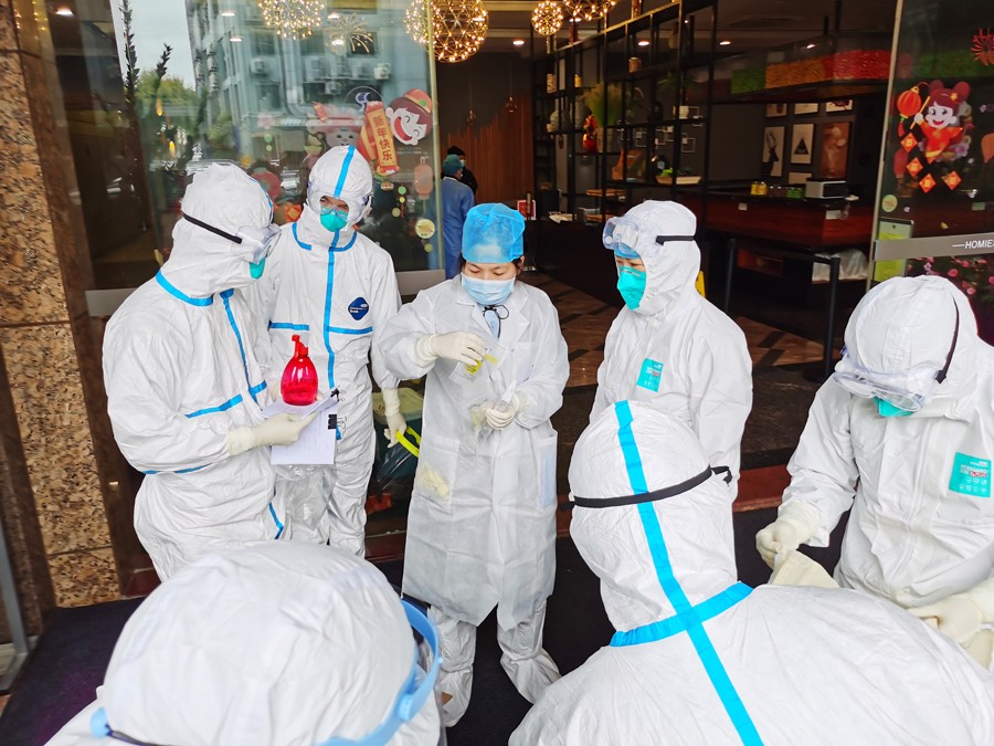 江淑仪(图中戴蓝帽者)在定点酒店准备采样