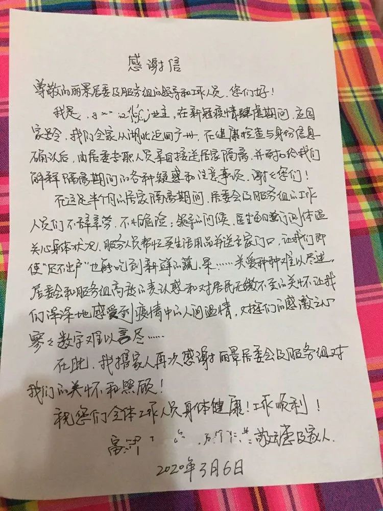 3月6日,在“三八”妇女节到来的前两天,番禺区大石街丽景社区网格员何翠英收到辖区丽某居501隔离户的感谢信!虽然只有一页纸,但却鼓舞了社区一线工作人员,把抗疫以来一个多月的疲倦都消除了!