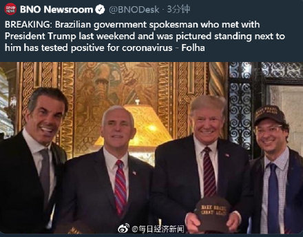 据荷兰媒体BNO Newsroom最新消息,巴西政府发言人新冠病毒检测结果为阳性。消息称,此人上周末曾与美国总统特朗普会面。