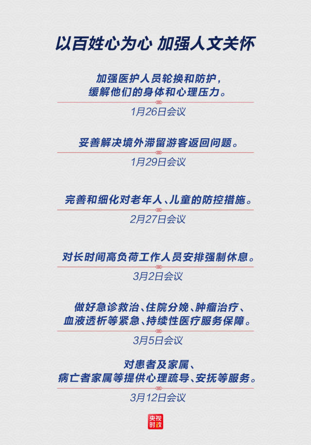 增强必胜之心、责任之心、仁爱之心、谨慎之心,这是2月23日习近平总书记在统筹推进新冠肺炎疫情防控和经济社会发展工作部署会议上对各级干部提出的要求,也是中央应对疫情工作领导小组秉持的初心。自成立以来开过的16次会议,始终体现着对英雄群体和困难群体的关怀、对民生问题和群众利益的关切。