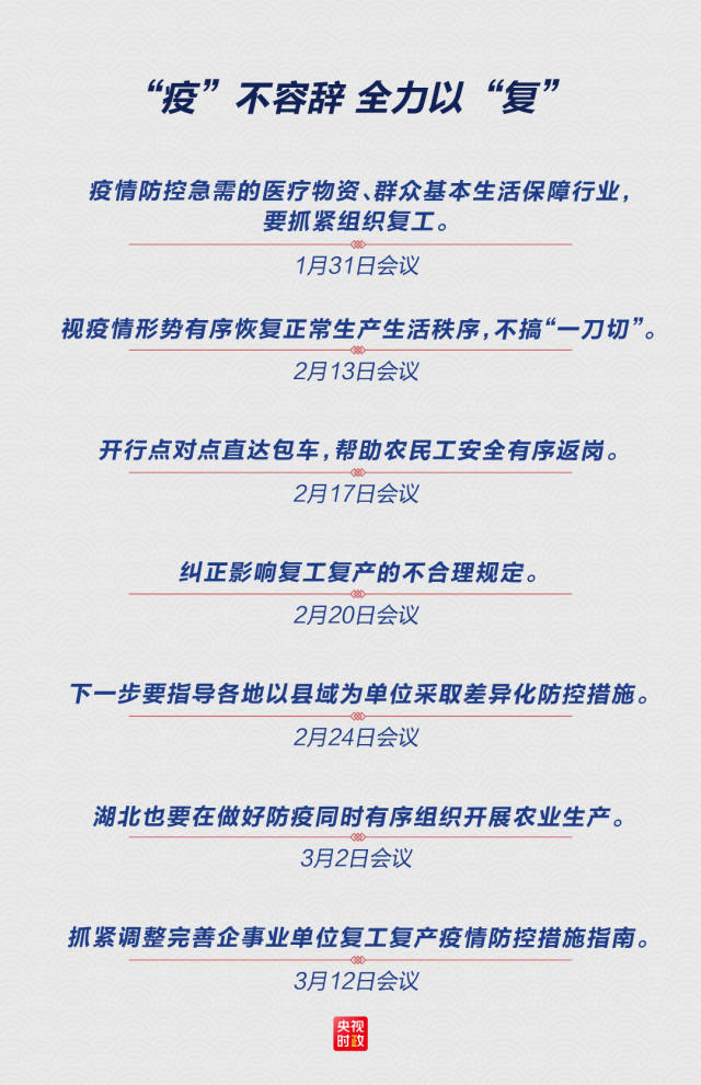 3月12日,习近平总书记考察武汉两天后,中央应对疫情工作领导小组召开了最新一次会议。会议要求,认真贯彻习近平总书记在湖北省考察疫情防控工作时的重要讲话精神,根据疫情形势变化分区分级做好防控和保障工作。