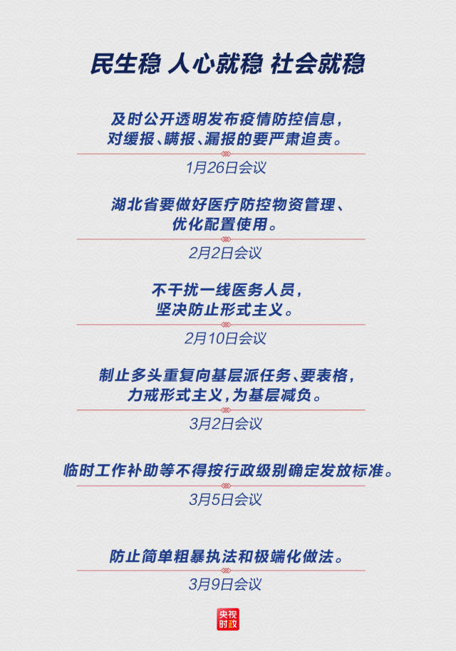3月10日,习近平总书记在武汉考察时说,民生稳,人心就稳,社会就稳。湖北和武汉等疫情严重地方的群众自我隔离了这么长时间,有些情绪宣泄,要理解、宽容、包容,继续加大各方面工作力度。中央应对疫情工作领导小组始终正视问题矛盾,积极回应社会关切。