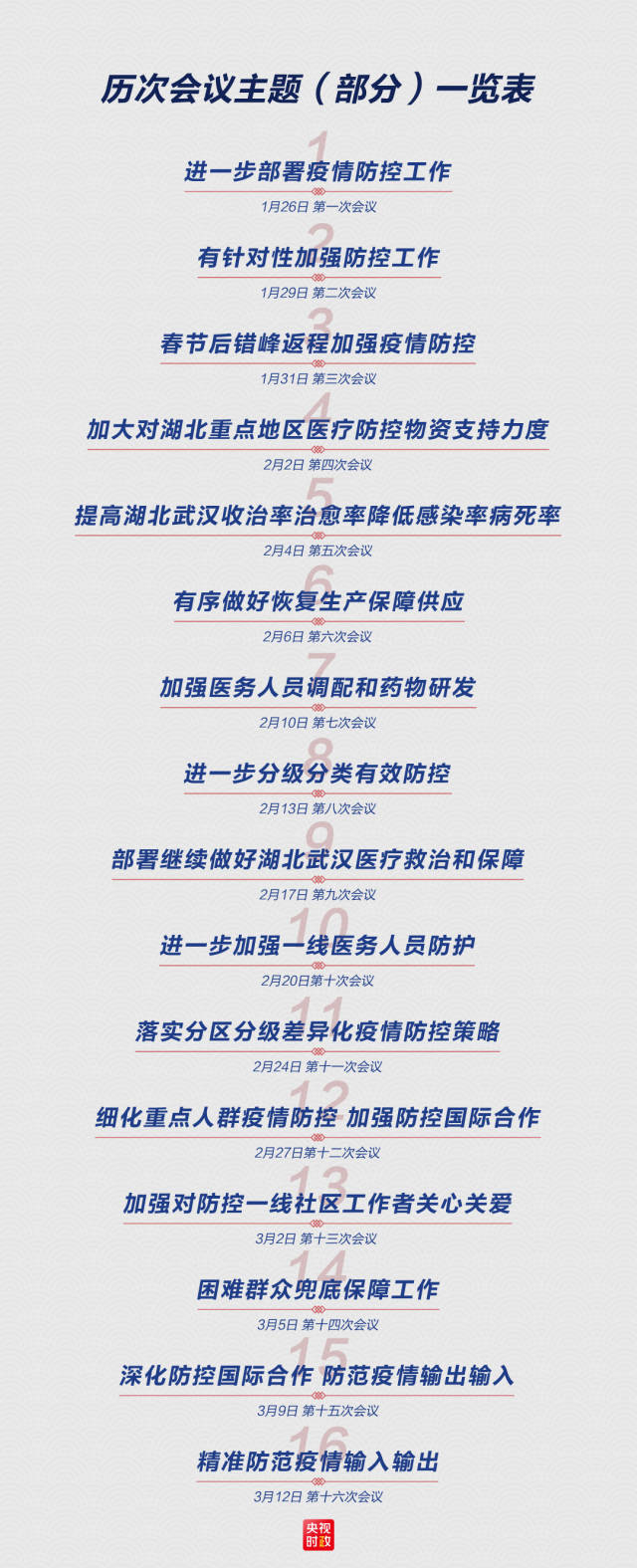 1月25日,农历正月初一,中央政治局常委会会议决定,党中央成立应对疫情工作领导小组。这是一个临危受命的领导小组。从成立次日召开第一次会议,到3月12日召开第16次会议,每一次会议都在研判疫情、议定对策、呵护民生。透过47天这16次会议,能够读懂这场仍在持续的疫情防控阻击战的一些脉络。