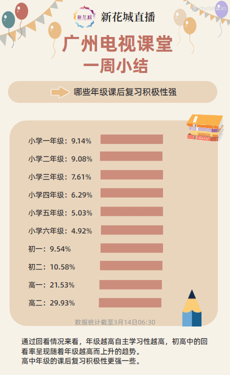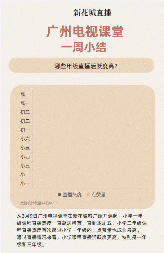 开播第一周,小学三年级的累计直播点击量11个年级中的最高,点赞量也最高。显示三年级小朋友课程活跃度比其他年级高。3月13日当日,小学三年级活跃程度明显升高,主要与下午增加了综合实践课程有关。“广州电视课堂”五育并举收到了实效。