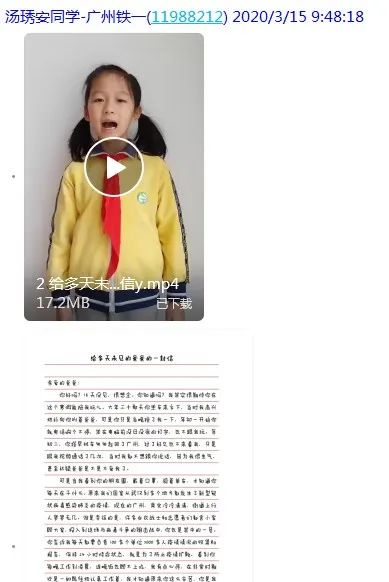 越秀区铁一小学的琇安同学给爸爸写信读信