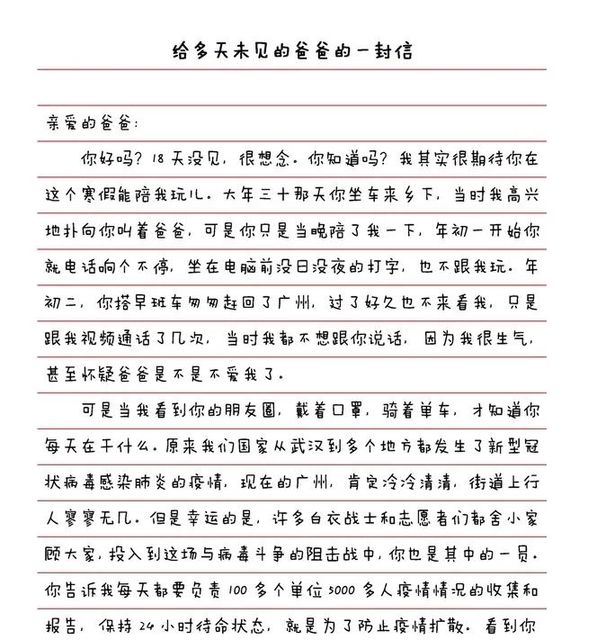 广州市八一实验学校的杨欣达同学的妈妈是一位交警。疫情期间,她放弃了休假,负责信息收集报送、突发事件应对等,为抗“疫”提供了有力支持。