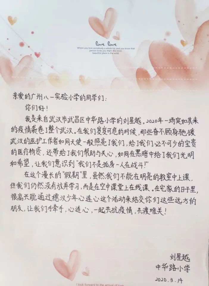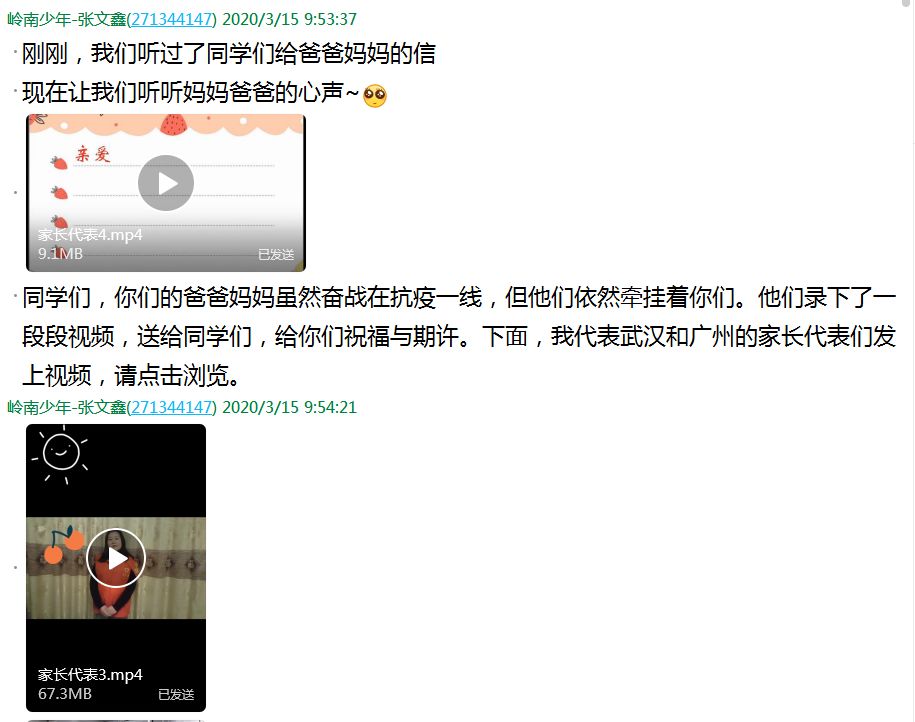 在“穗汉少年心连心 守望相助战疫情”武汉市江岸区汉铁小学、广州市越秀区铁一小学两校交流活动中,武汉市江岸区汉铁小学、广州市越秀区铁一小学的同学写了一些心里话,拍了一些视频,给正奋战在抗议一线的亲人们,表达了他们的牵挂,也给他们加油打气。而他们的爸爸妈妈尽管奋战在抗疫一线,但他们依然牵挂着你们。他们录下了一段段视频,给孩子们送去祝福与期许。