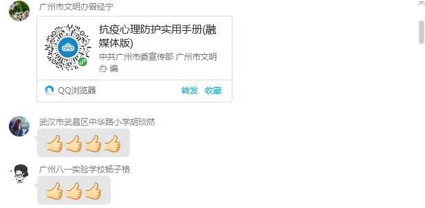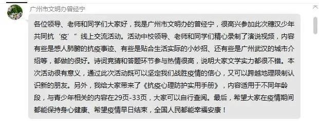 活动中,所有同学们都收到了来自广州市文明办的一份特别的礼物——《抗疫心理防护实用手册》。广州市文明办的曾经宁介绍,这本书的内容适用于不同年龄段的人群,与青少年相关的内容在29页-33页。电子书一经发出,老师、孩子们纷纷点赞!