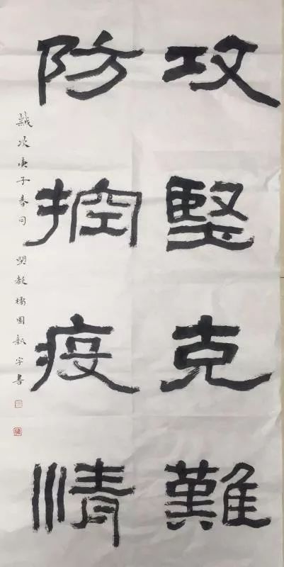 广州市文旅系统党员干部积极发挥表率作用,连续多日在岗值班、任劳任怨、恪尽职守,一幅幅舍弃小家团圆、担当家国使命的动容场景,无不让艺术创作者们感动和心疼。广州市书协会员、广州市文旅局干部金新宇触景生情,写下竖幅隶书作品《攻坚克难 防控疫情》,结构稳健厚重、笔触清劲秀雅,献给为抗击肺炎疫情而英勇奋战的全体勇士们。