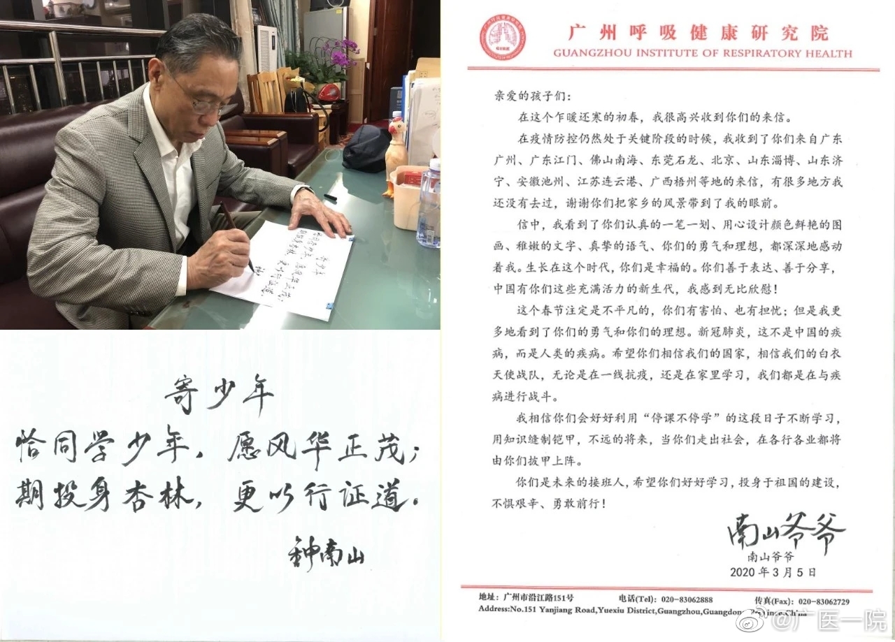 钟南山院士对收到小朋友的来信,十分珍视,他认真阅读了一封封来信,并亲笔写下了对青少年的寄语。
