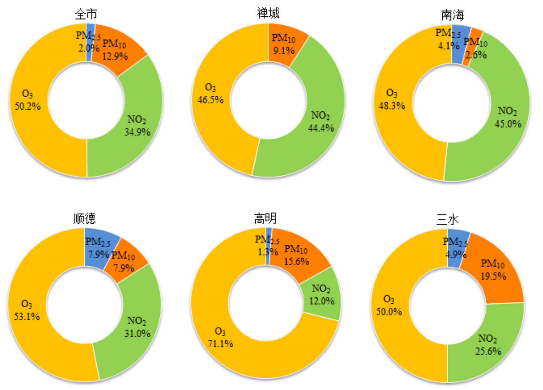 2019年全市环境空气质量综合指数为4.31,五区环境空气质量综合指数在3.91~4.53之间。2019年度五区环境空气质量综合指数由优至差依次为:高明区、顺德区、三水区、南海区、禅城区。