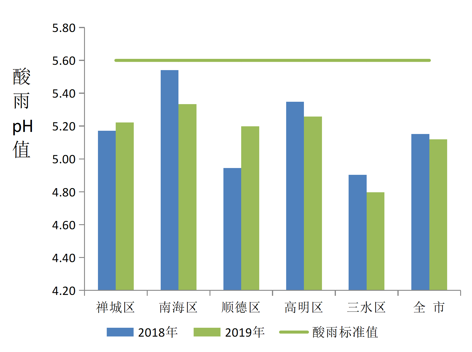 禅城区、顺德区降水pH值均值较上年有所上升;南海区、三水区、高明区降水pH值均值有所下降。