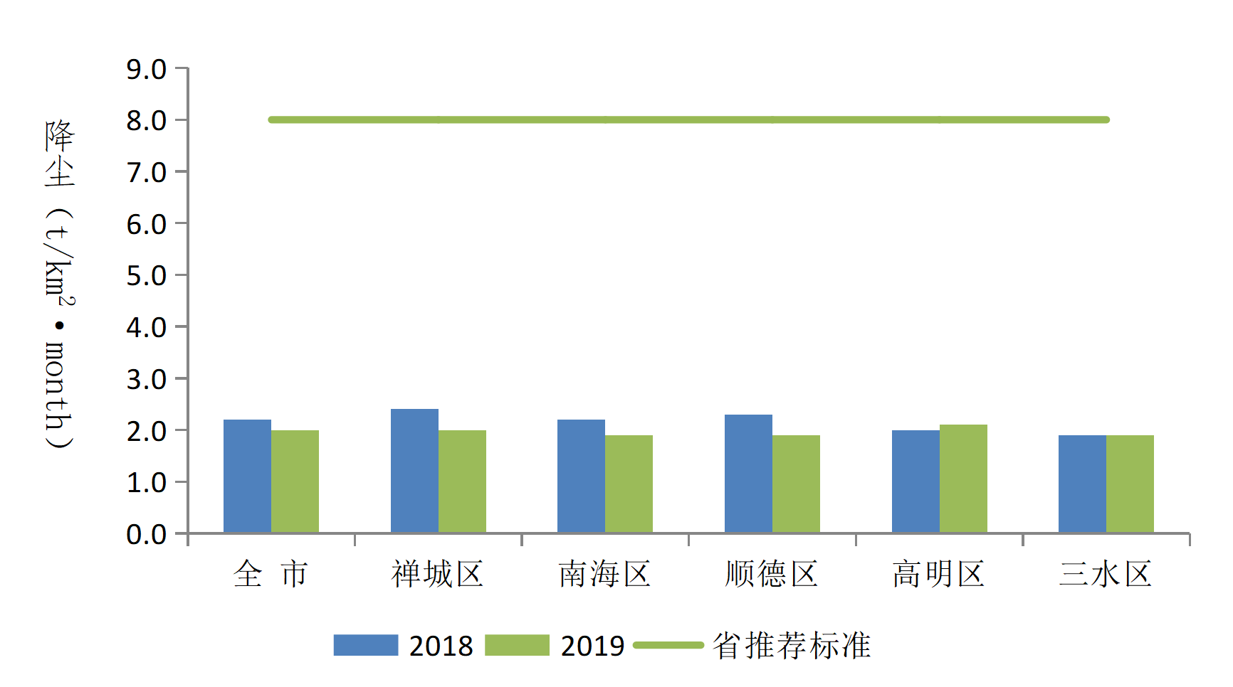 2019年佛山市降尘年月平均浓度值为2.0吨/(平方公里•月),比上年下降9.1%,达到省推荐标准。五区降尘年月平均浓度范围为1.9~2.1吨/(平方公里•月),均优于省推荐标准。与上年相比,除高明区外,其余四区年降尘平均浓度大都有所下降。