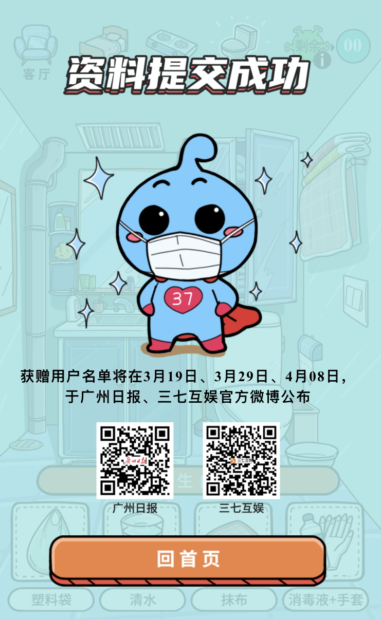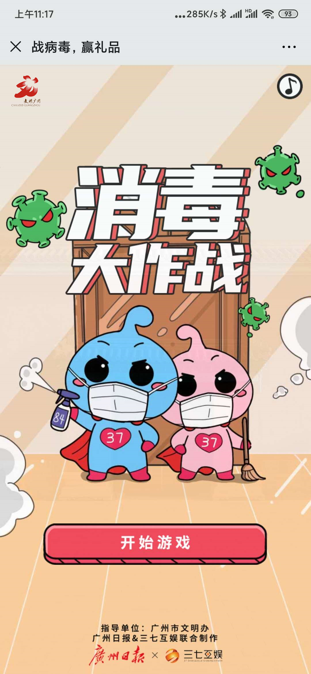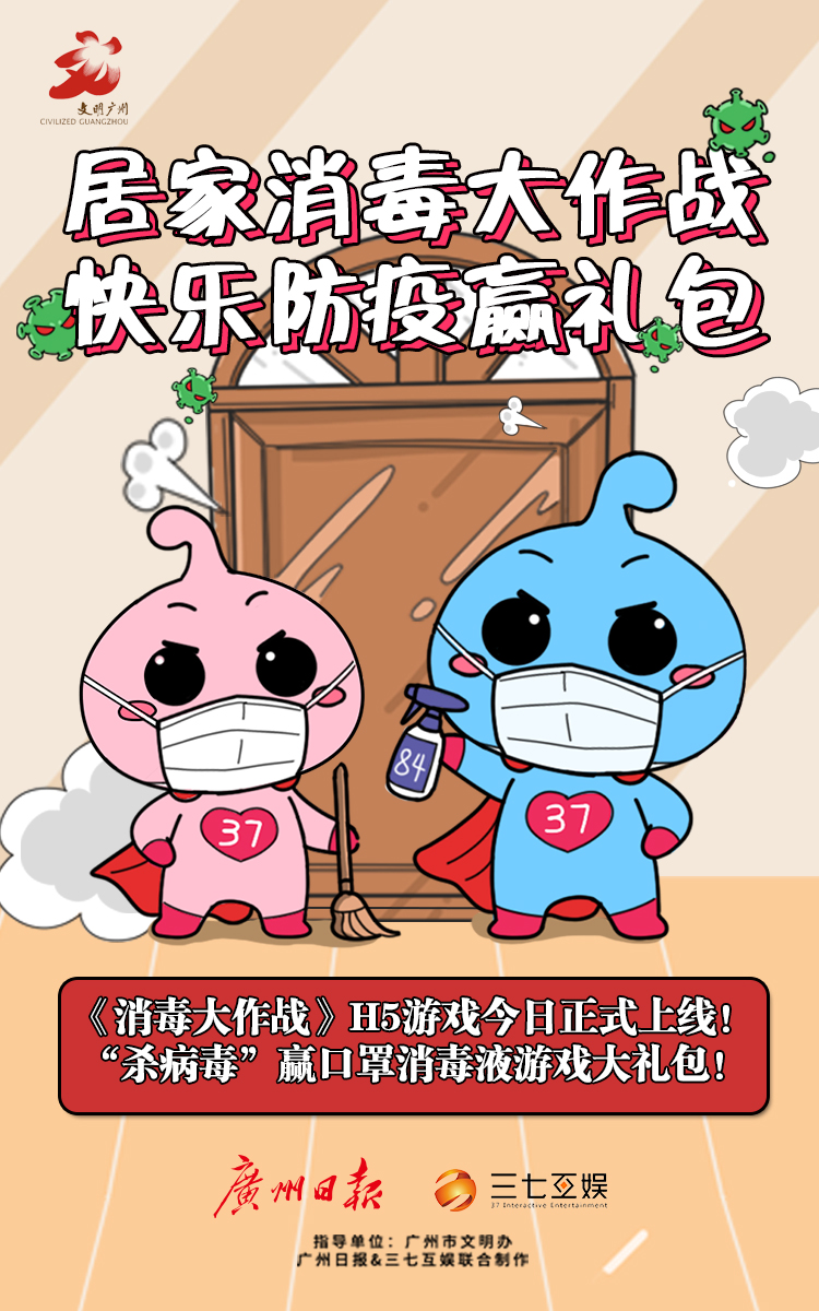 3月9日,在广州市文明办指导下,广州日报联合三七互娱筹备一个月设计制作的《消毒大作战》H5游戏隆重推出。上线一周后,已有近4万人次参加游戏,最高分玩家达6500积分,即消灭了6500个病毒,可谓是“居家消毒达人”。3月19日将公布首批20个幸运用户名单,还未注册的市民赶紧填报资料,轻点手机屏幕进行居家消毒大作战,完成全部房间消毒清扫后,就可快乐防疫赢礼包!