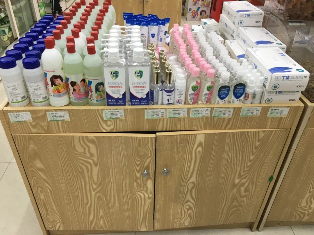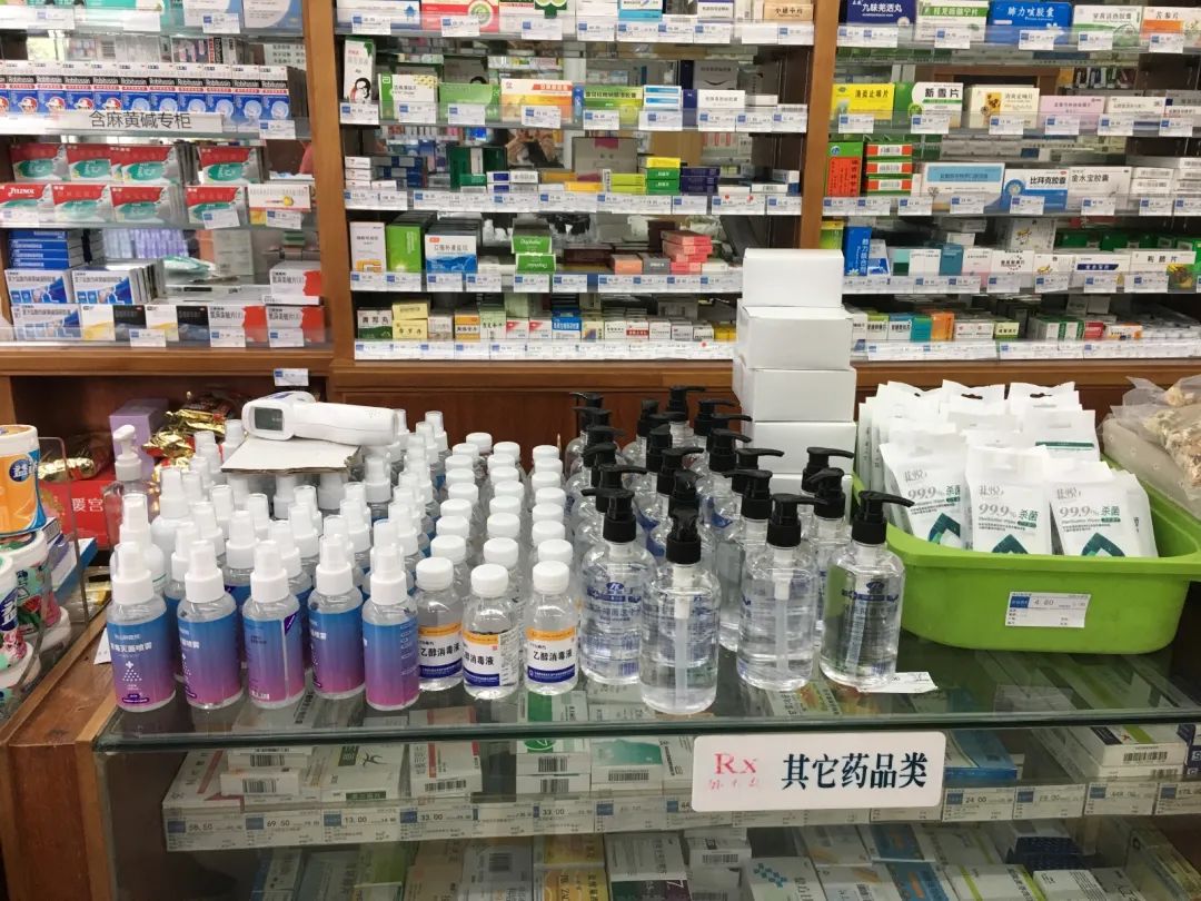 小e在现场看到,基本上所有药店都在进店显眼处设置了防护用品区,其中包括酒精、免洗洗手液、84消毒液等,货源充足。
