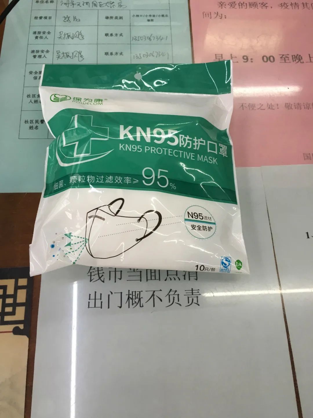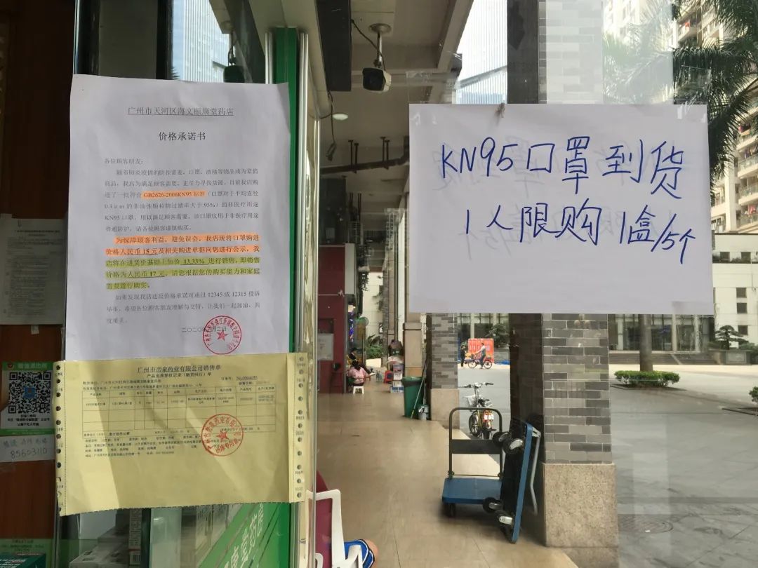 小e在现场看到,部分药店在门口已经挂出有口罩出售的告示,位于猎德村公司广场的颐康堂就在门口贴出“KN95口罩到货 1人限购1盒/5个”的字样,并张贴有价格承诺书及相关购进单据,其显示该店将口罩购进价格人民币15元及相关购进单据进行公示,并在进货价基础上加价13.33%进行销售,即销售价格为人民币17元/个。