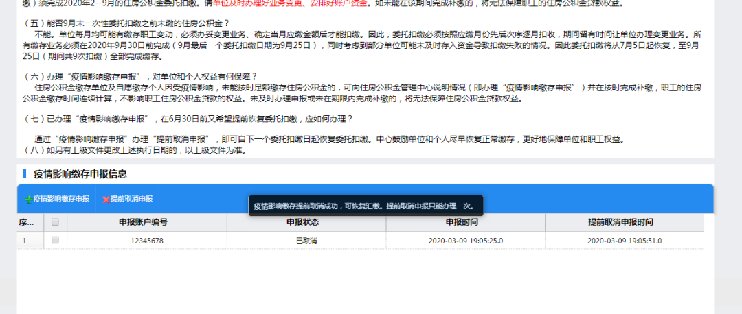 目前,佛山市住房公积金管理中心“疫情影响缴存申报”功能已经上线,符合上述政策的单位(或自愿缴存个人)可登录中心网上办事大厅,通过“疫情影响缴存申报”功能即可零资料、零跑动完成申报。需要注意的是该功能的申报只能办理一次,提前取消申报也只可办理一次。