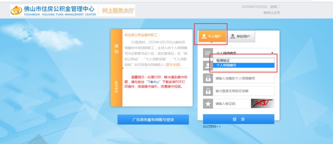 2、登陆界面,单位输入单位明细编号以及密码,自愿缴存个人可使用个人明细编号方式或短信验证方式进行登陆。