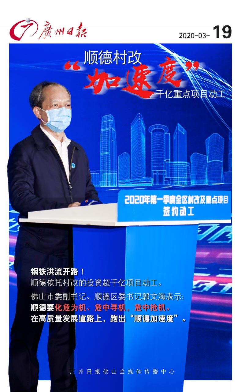 在3月17日下午,顺德2020年第一季度顺德区村改及重点项目签约动工后,顺德十个镇街同步举行2020年第一季度村改项目动工仪式。顺德杏坛,准备拆除光华德彦产业园500多亩连片改造用地上,几十台推土机组成滚滚铁流同时动工,场面蔚为壮观。佛山市委副书记、顺德区委书记郭文海表示,顺德要化危为机、危中寻机,危中抢机,力争今后每一个季度都需要有项目签约和落地,在高质量发展道路上,跑出“顺德加速度”。