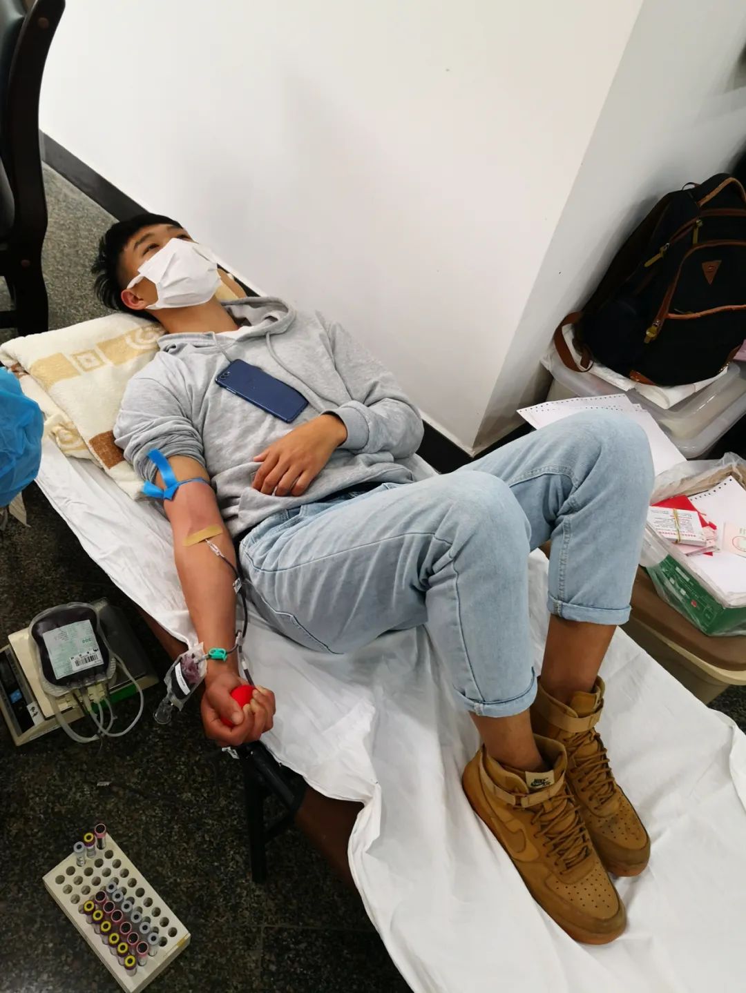 21岁的黎浩贤也是其中一员。得知有献血的活动,他主动报名参加。第一次献血的黎浩贤有些紧张,加上前一晚睡眠不足,献血过程中,他出现了晕眩的情况,在场的医护人员立刻拿来担架,让黎浩贤平躺缓解,在担架上,他继续完成了300ml的献血量。